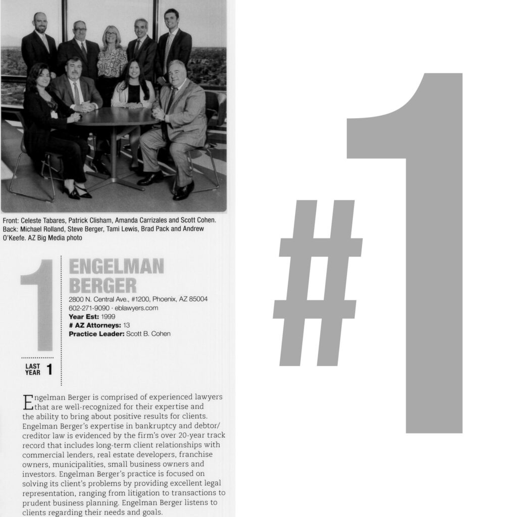We are thrilled to announce that Engelman Berger has again been ranked #1 in the 2024 edition of Ranking Arizona: The Best of Arizona Business in the category for law. Our team of attorneys received this recognition for Creditor’s Rights and Bankruptcy/Reorganization. Please join us in congratulating our hard working and dedicated attorneys who bring […]